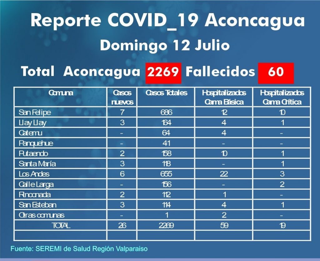 En tanto el Seremi de Salud (s) confirmó 26 nuevos casos de covid 19 en Aconcagua. Santa María 3 Putaendo 2 San Felipe 7 Llay Llay 3 San Esteban 3 Los Andes 6 Rinconada 2.