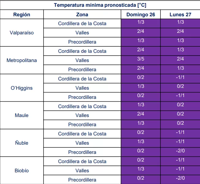 Frente al pronóstico de bajas temperaturas mínimas en distintos sectores entre las regiones de Valparaíso y Bío Bío, incluyendo cordillera de la costa, valles y precordillera, se recomienda a los agricultores tomar medidas preventivas ante eventuales heladas para los días domingo 26 y lunes 27.