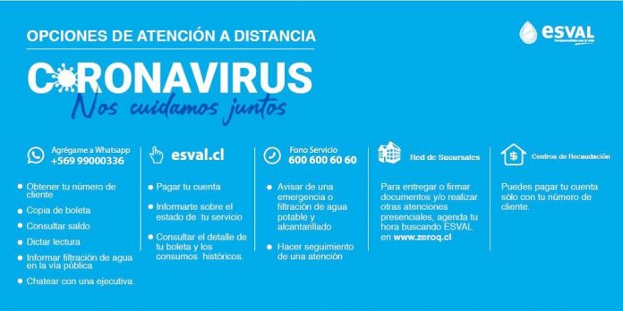 “Invitamos a nuestros clientes a preferir nuestras plataformas remotas para contactarse con Esval, a través de nuestra oficina virtual en www.esval.cl, al WhatsApp +569 99000336, o la línea de atención 600 600 60 60, donde podremos ayudarles con sus trámites habituales”, concluyó.